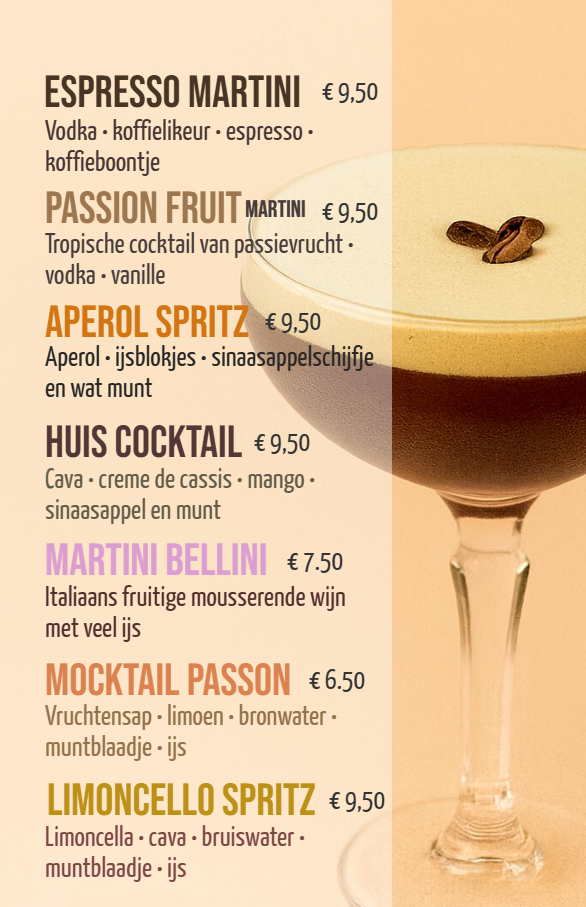 Allemaal terug te vinden op de uitgebreide maar ook scherp-geprijsde menukaart die u overigens hier kunt bekijken: klik hier.